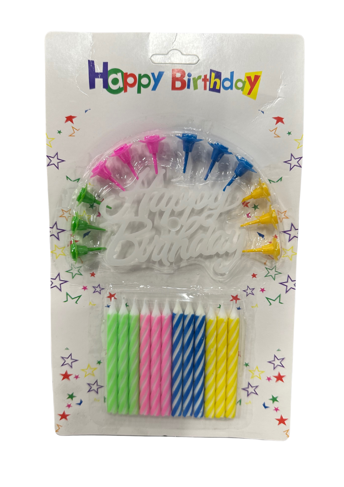 اجعل أجواء عيد ميلادك أكثر فرحًا وتألقًا مع شموع عيد ميلاد ملونه المميزة. تأتي المجموعة بـ 24 شمعة بألوان زاهية مثل الأحمر، الأخضر، والأزرق، مع تصميمات مرحة تحمل عبارة Happy Birthday لتضيف لمسة سحرية إلى كعكة الاحتفال.
